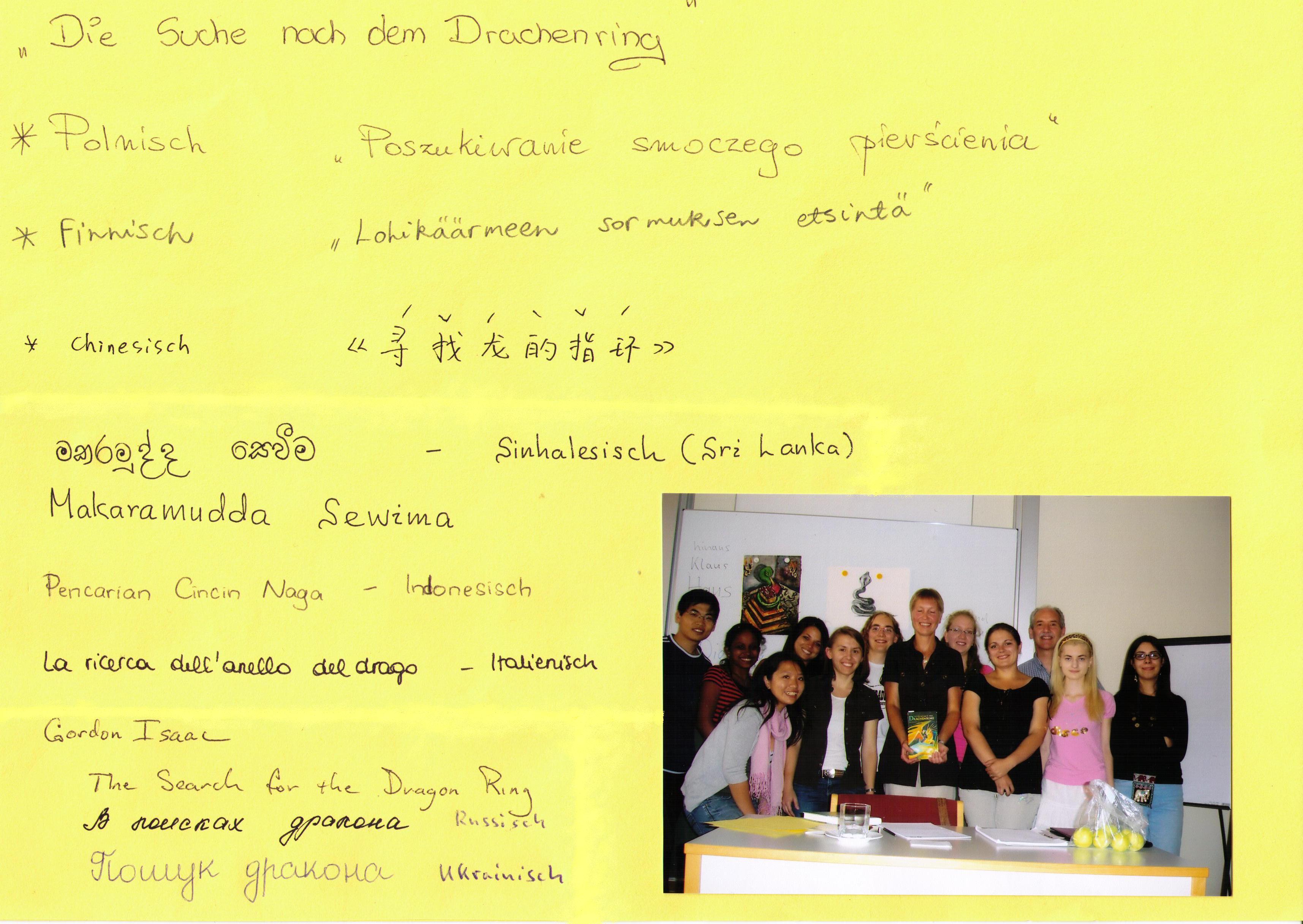 kleine Geschichten geschrieben und zum Schluss hat mir jeder Teilnehmer „Die Suche nach dem Drachenring“ in seine jeweilige Landessprache übersetzt.