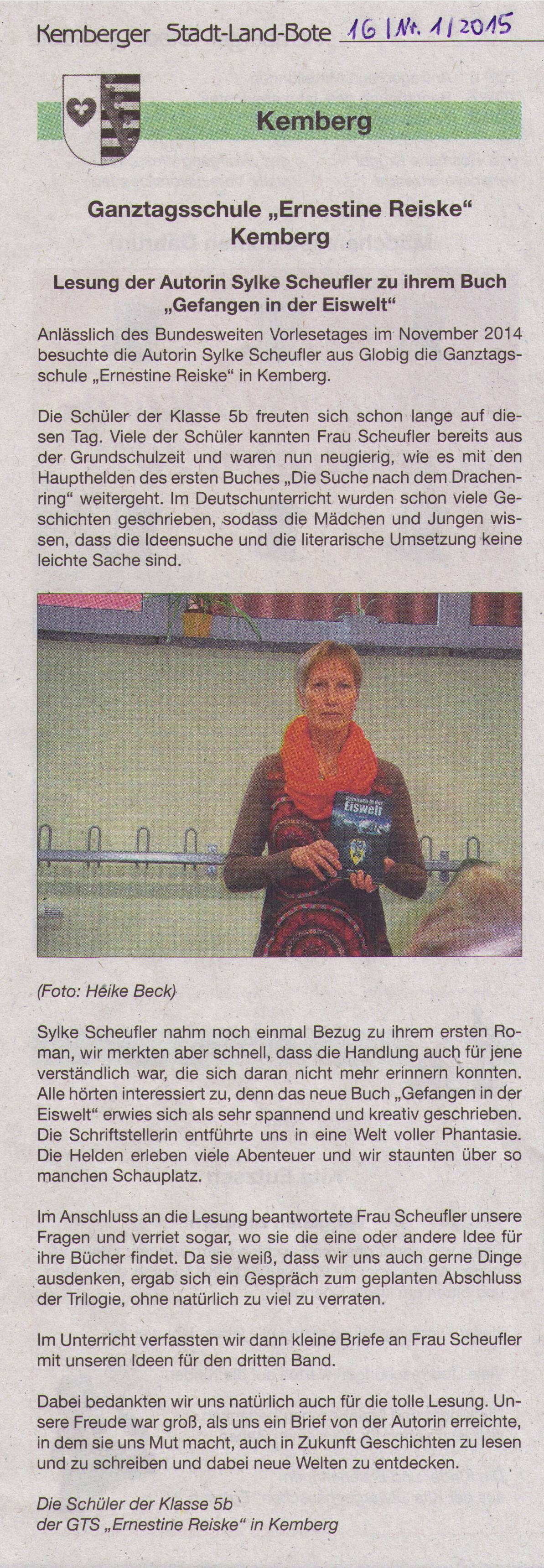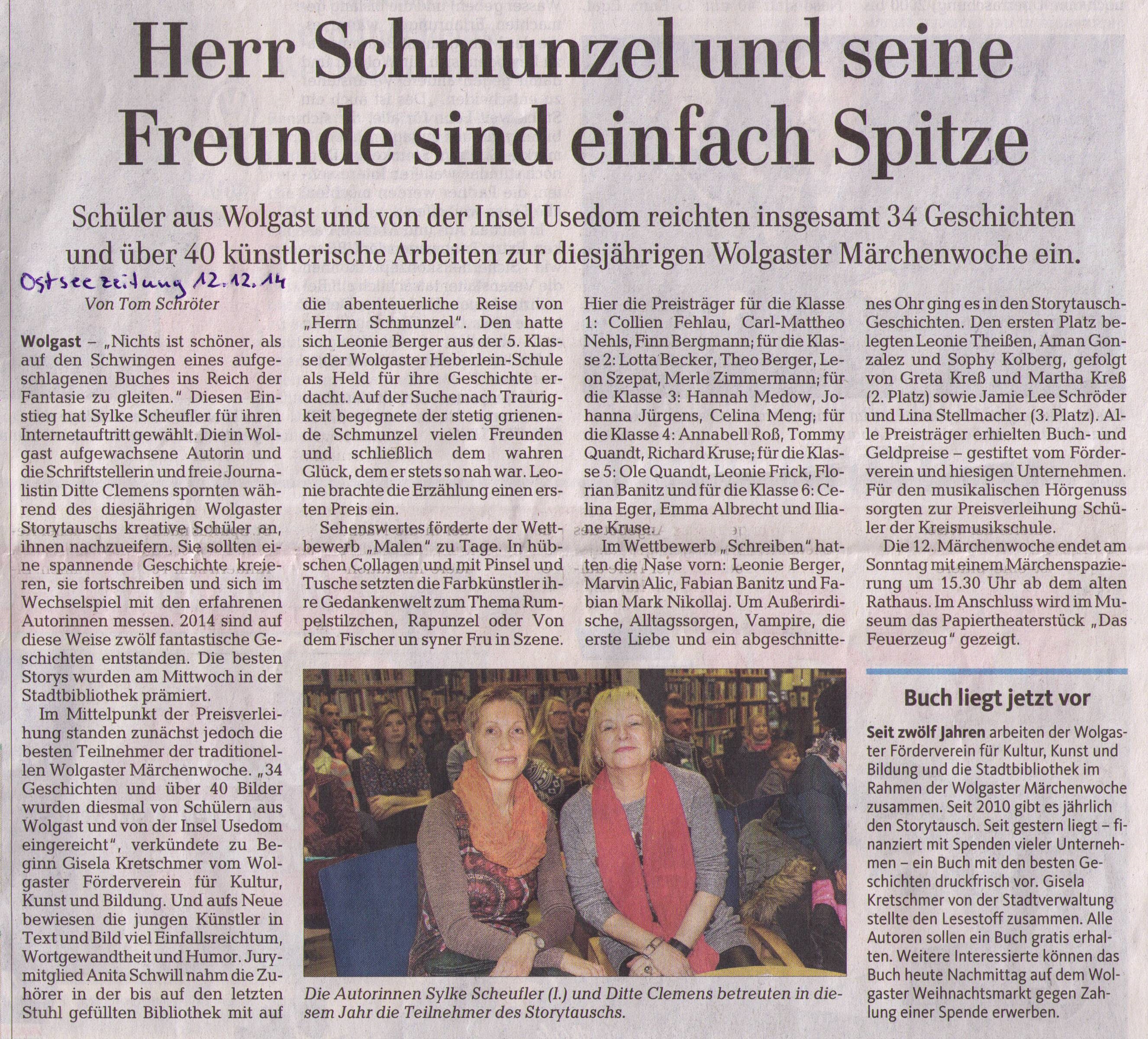 Ostseezeitung vom 12. Dezember 2014. Die Schüler, die im Storytausch den 1. und 2. Platz belegten, haben gemeinsam mit mir an den Geschichten
